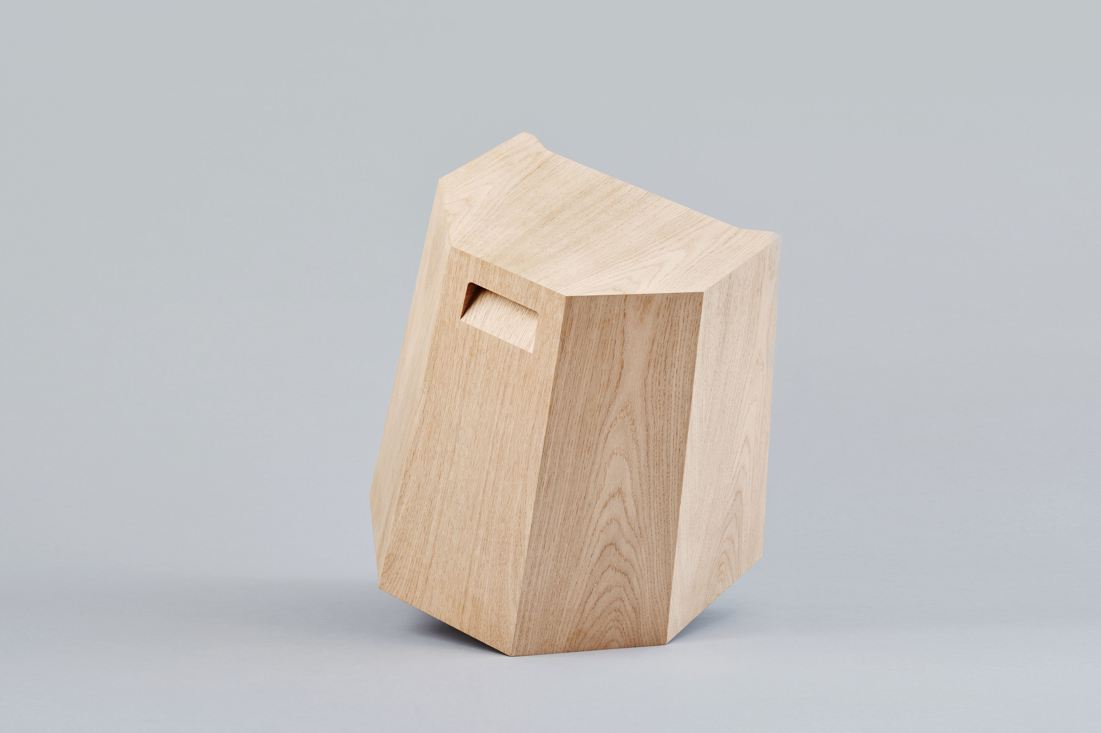 My idea was to challenge the traditional craftsmanship and to design a stool which seems to be carved out from a single piece of wood. The stool possesses a strong character and graphical appearance, due to the plain angled surfaces and the milled sections.